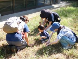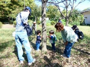 そのあとは、園内をゆっくり周りながら、どんぐりや落ち葉を見つけて拾い集めていきます。