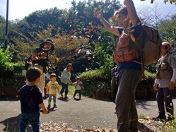 カサカサ音を立ててみたり、上から落として落ち葉シャワー!