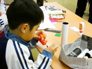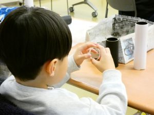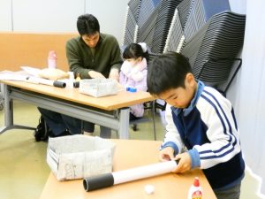 キットを使い、紙の筒を組み合わせて望遠鏡を組み立てます。